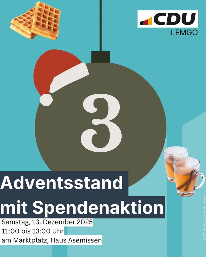 mehr🎄 Tradition trifft Engagement ? unser Adventsstand 2025! 🤝✨Am Samstag, 13. Dezember, steht unser Adventsstand wieder auf dem Lemgoer Marktplatz ? von 11 bis ca. 13 Uhr.Unter dem Motto "Waffeln für die Nachbarschaft" sammeln wir in diesem Jahr Spenden für das ehrenamtliche Nachbarschaftskaffee, das mit ganz viel Herz Begegnung, Miteinander und Gemeinschaft in unserer Stadt ermöglicht. ❤️Natürlich gibt?s auch wieder:🧇 frisch gebackene Waffeln☕ duftenden Kaffee🍷 leckeren Punsch"Der Adventsstand ist für uns jedes Jahr eine Herzensangelegenheit. Wir möchten den Menschen in Lemgo eine schöne, besinnliche Zeit bereiten ? und diejenigen unterstützen, die sich mit großem Engagement für unsere Stadt einsetzen", so Steven Grimshaw, Vorsitzender der CDU Lemgo.👉 Die Spendenaktion läuft auch nach dem Stand weiter ? während unserer Bürozeiten und bei kommenden Veranstaltungen.Wir freuen uns auf euch! Kommt vorbei, genießt die Vorweihnachtszeit und tut gleichzeitig etwas Gutes. ?#CDULemgo #Lemgo #Adventsstand #WaffelnFürDieNachbarschaft #Nachbarschaftskaffee #Engagement #Gemeinschaft #WeihnachtenInLemgo #AlteHansestadtLemgo #GutesTun #Weihnachtszeit