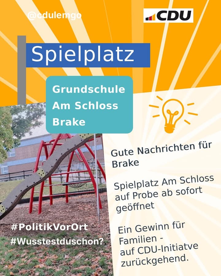 🎉 Gute Nachrichten für Brake! 🎉Der Spielplatz auf dem Gelände der Grundschule Am Schloss ist seitens der Stadt offiziell geöffnet und steht Kindern im Alter von 5-12 nun als öffentliche Spielfläche zur Verfügung. Das ist ein echter Gewinn für Familien und den gesamten Ortsteil. 👨👩👧👦🛝Wir als CDU Lemgo begrüßen diese Entscheidung ausdrücklich. Besonders freut uns, dass die Öffnung auf einen Prüfauftrag unserer Braker CDU-Mitglieder zurückgeht, die sich frühzeitig für mehr wohnortnahe Spiel- und Bewegungsmöglichkeiten eingesetzt haben. Dieser Impuls wurde von der Verwaltung aufgegriffen und schließlich politisch beschlossen .Der Haupt- und Finanzausschuss hat die Öffnung des Schulhofes bereits im September einstimmig für ein Jahr auf Probe beschlossen ? ein gutes Beispiel dafür, wie konstruktive Anträge aus den Ortsteilen konkrete Verbesserungen für die Menschen vor Ort bewirken können .Dass der Schulhof nun ? wie von der Stadt angekündigt ? bereits genutzt werden kann, zeigt: Politik wirkt, wenn sie nah an den Bedürfnissen der Bürgerinnen und Bürger ist .👉 Wir bleiben dran ? für lebendige Ortsteile, kurze Wege und ein familienfreundliches Lemgo.#CDULemgo #Brake #GrundschuleAmSchloss #Familienfreundlich #Spielplatz #OrtsteileStärken #PolitikVorOrt